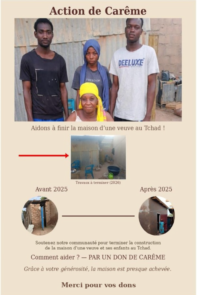 Dimanche 29 mars 2026 à la sortie de la messe : Action de Carême avec collecte de fonds pour construire la maison d’une veuve au Tchad